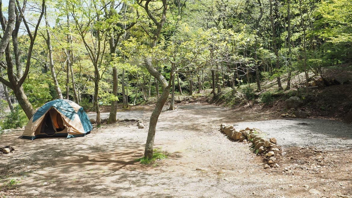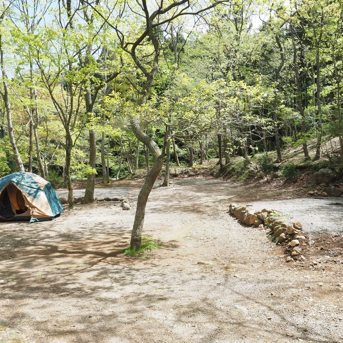 沢口川上流のダムを見下ろせる林間サイト。下界で遊ぶ子供たちをのんびりと眺める時間も過ごせます。